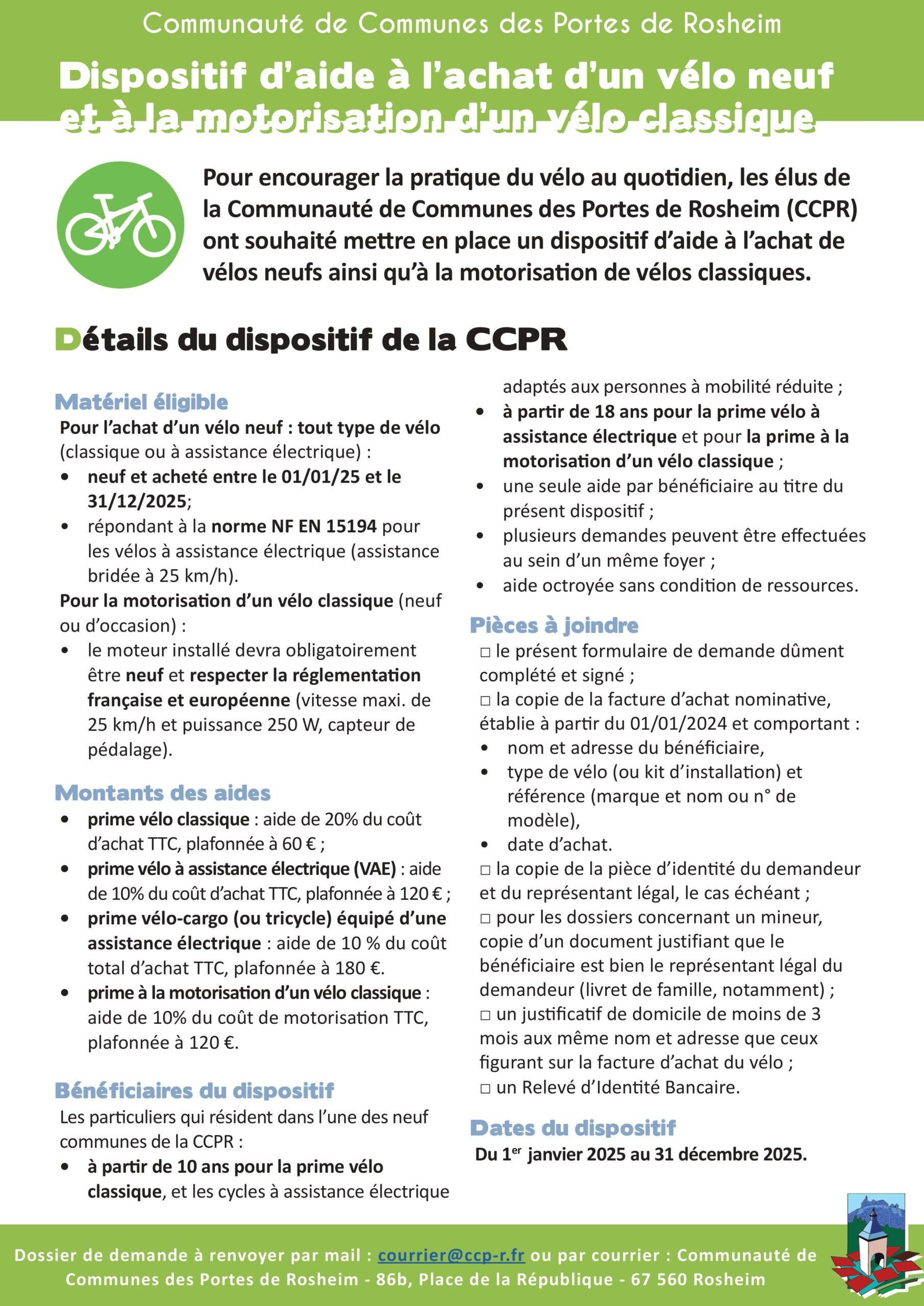 Pour encourager la pratique du vélo au quotidien, les élus de la Communauté de Communes des Portes de Rosheim (CCPR) ont mis en place un dispositif d’aide à l’achat de vélos neufs ainsi qu’à la motorisation de vélos classiques.