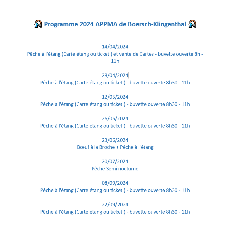 L’APPMA de Boersch-Klingenthal organise une pêche le dimanche 12 mai de 8h30 à 11h.