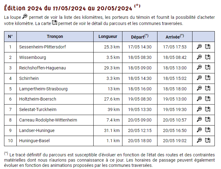 Entre Wissembourg et Bâle, ce sont neuf étapes qui baliseront le parcours avec seize communes de départ ou d’arrivée, pouvant donner lieu à autant d’animations ; en plus de toutes celles organisées sur son passage dans les villages où la course s’arrêtera un moment pour se confondre dans la fête, du Nord au Sud de l’Alsace.